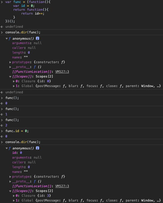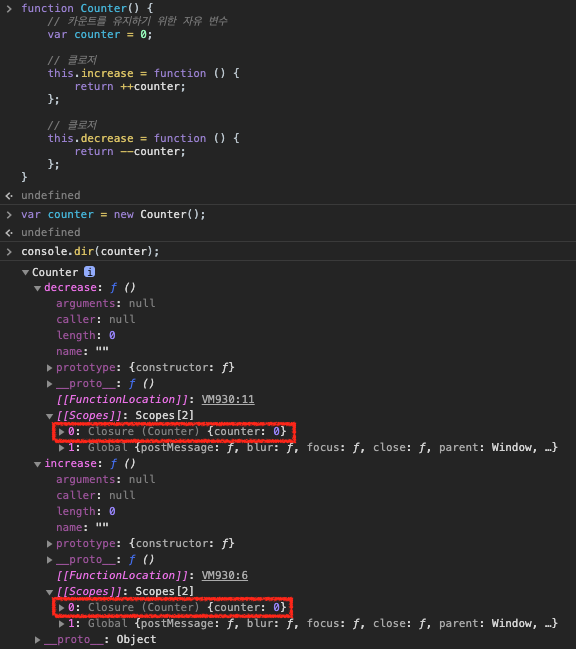 <!DOCTYPE html> <html> <body> <p>지역 변수를 사용한 Counting</p> <button id="inclease">+</button> <p id="count">0</p> <script> var incleaseBtn = document.getElementById('inclease'); var count = document.getElementById('count'); function increase() { // 카운트 상태를 유지하기 위한 지역 변수 var counter = 0; return ++counter; } incleaseBtn.onclick = function () { count.innerHTML = increase(); }; </script> </body> </html>function Counter() { // 카운트를 유지하기 위한 자유 변수 var counter = 0; // 클로저 this.increase = function () { return ++counter; }; // 클로저 this.decrease = function () { return --counter; }; } var counter = new Counter(); console.log(counter.increase()); // 1 console.log(counter.decrease()); // 0