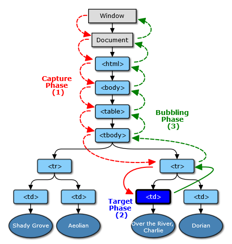 즉, 이벤트가 발생했을 때 캡처링과 버블링은 순차적으로 발생한다. IE8 버전에서 지원되지 않는다.