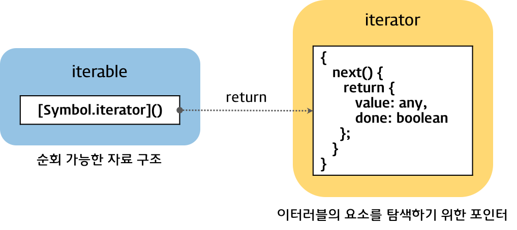 /* Symbol.iterator 의 내부 변수는 외부로 전달이 불가능하다. 이 특성을 이용하여 다양한 구현이 가능하다. Symbol.iterator 메소드는 next 메소드를 소유한 이터레이터를 반환해야 한다. next 메소드는 이터레이터 리절트 객체를 반환하며 순회시 마다 호출이 된다. */ const fibonacci = { [Symbol.iterator]() { let [pre, cur] = [0, 1]; const max = 10; //return iterator return { next() { [pre, cur] = [cur, pre + cur]; return { value: cur, done: cur >= max }; } }; } }; // 반복문 에서의 사용 for (const num of fibonacci) { console.log(num); } // spread 문법 const arr = [...fibonacci]; console.log(arr); // [ 1, 2, 3, 5, 8 ] // destructuring const [first, second, ...rest] = fibonacci; console.log(first, second, rest); // 1 2 [ 3, 5, 8 ]const fibonacciFunc = function (max) { let [pre, cur] = [0, 1]; return { [Symbol.iterator]() { return { next() { [pre, cur] = [cur, pre + cur]; return { value: cur, done: cur >= max }; } }; } }; }; for (const num of fibonacciFunc(10)) { console.log(num); }const fibonacciFunc = function (max) { let [pre, cur] = [0, 1]; /* Symbol.iterator 메소드와 next 메소드를 소유한 이터러블이면서 이터레이터인 객체를 반환 하려면 위 예지와 다르게 감싸는 구조가 아닌 별도의 프로퍼티로 구성하면 된다. */ return { [Symbol.iterator]() { return this; }, next() { [pre, cur] = [cur, pre + cur]; return { value: cur, done: cur >= max }; } }; }; let iter = fibonacciFunc(10); // 이터레이터로 활용되는 코드 console.log(iter.next()); // {value: 1, done: false} console.log(iter.next()); // {value: 2, done: false} console.log(iter.next()); // {value: 3, done: false} console.log(iter.next()); // {value: 5, done: false} console.log(iter.next()); // {value: 8, done: false} console.log(iter.next()); // {value: 13, done: true} iter = fibonacciFunc(10); // 이터러블로 활용되는 코드 for (const num of iter) { console.log(num); }const fibonacciFunc = function () { let [pre, cur] = [0, 1]; return { [Symbol.iterator]() { return this; }, next() { [pre, cur] = [cur, pre + cur]; return { value: cur }; } }; }; // 제약을 걸지 않으면 무한히 생성된다. for (const num of fibonacciFunc()) { if (num > 10000) break; console.log(num); } // 원하는 값만 취득하는 방식 const [f1, f2, f3] = fibonacciFunc(); console.log(f1, f2, f3); // 1 2 3